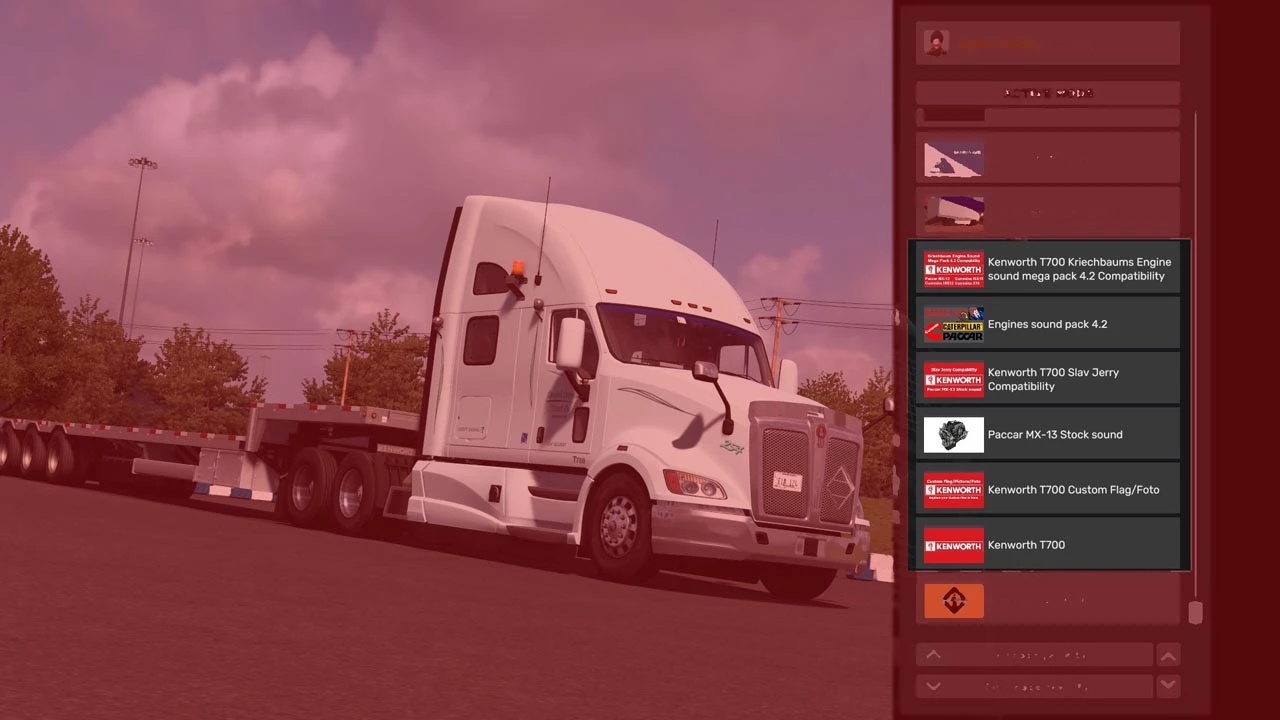 The truck uses stock sound from Paccar engines from ETS2 but i created some auxiliary mods to make it compatible with Kriechbaums Engine Mega Pack 4.2 and Slav Jerrys MX-13 mod on Steam. You also can hang your on flag or put a personalized photo in your cab. Just download the Custom Flag/Photo mod and replace the .DDS files with your own. Keep in mind to get the right picture size.