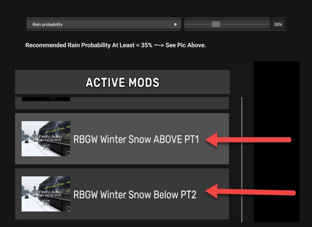 Important: Do not use with any other Weather & Rain & Graphics type or similar mods please Disable them