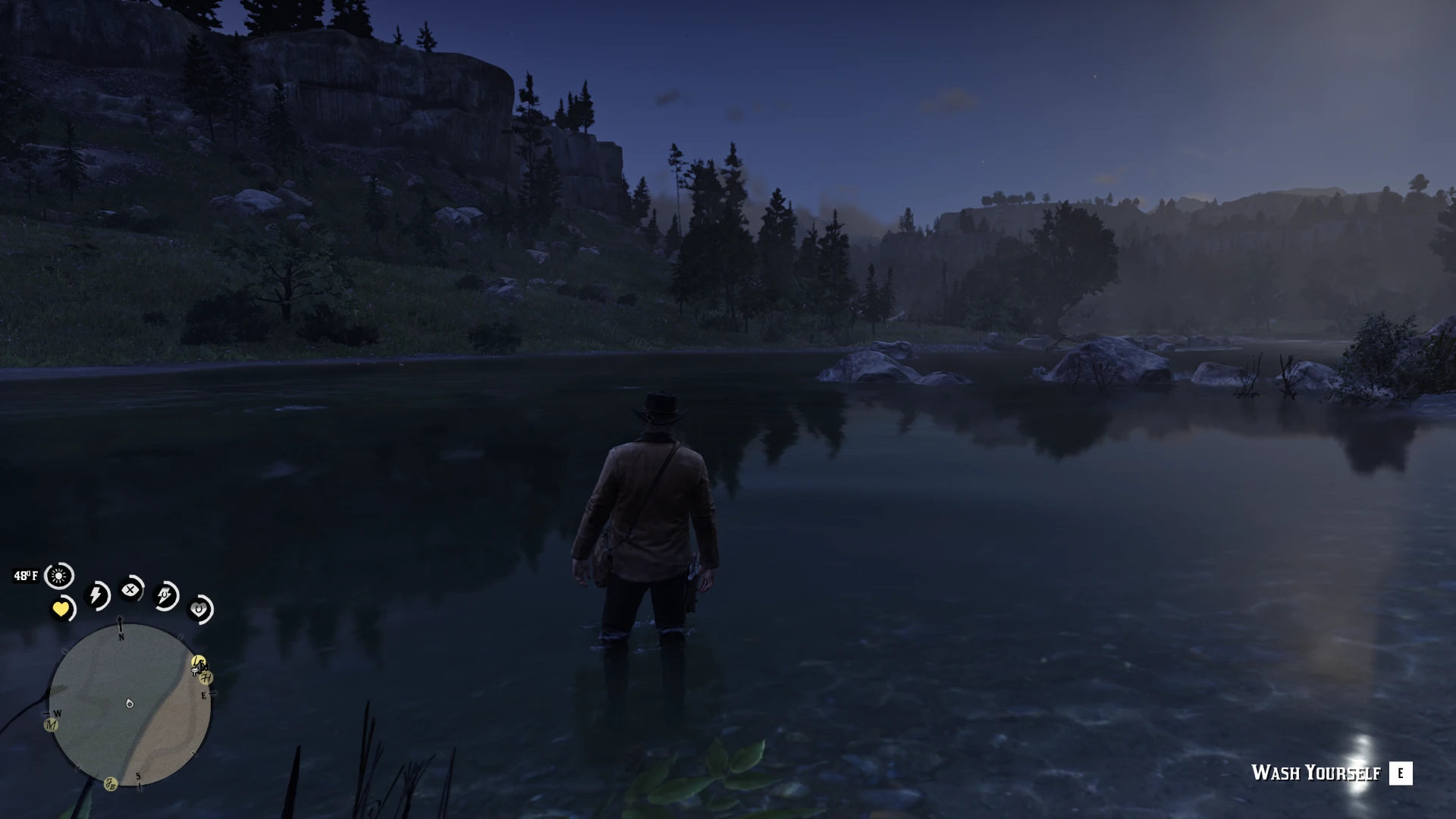 Wash Yourself is an immersive gameplay mod that allows Arthur or John to clean themselves in shallow water while exploring the world. Rivers, lakes, streams, ponds, and other shallow bodies of water can be used to wash away dirt, blood, mud, and grime at any time, without relying on hotel baths.