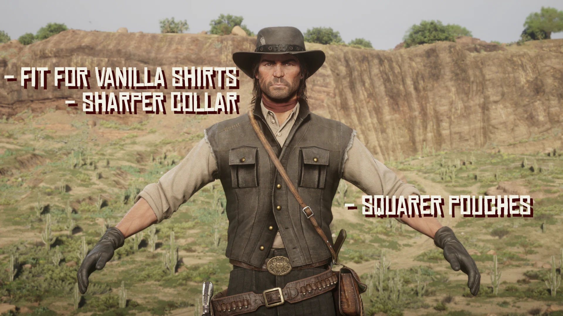 A simple vest remodel that remakes John’s Cowboy Vest into something that better resembles the RDR equivalent of the vest by modifying its Collar, Pouches, and general Sillhouette. All assets are custom-made.