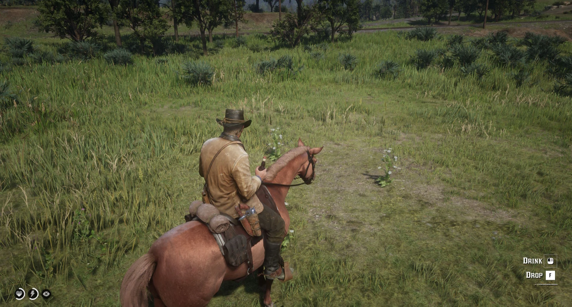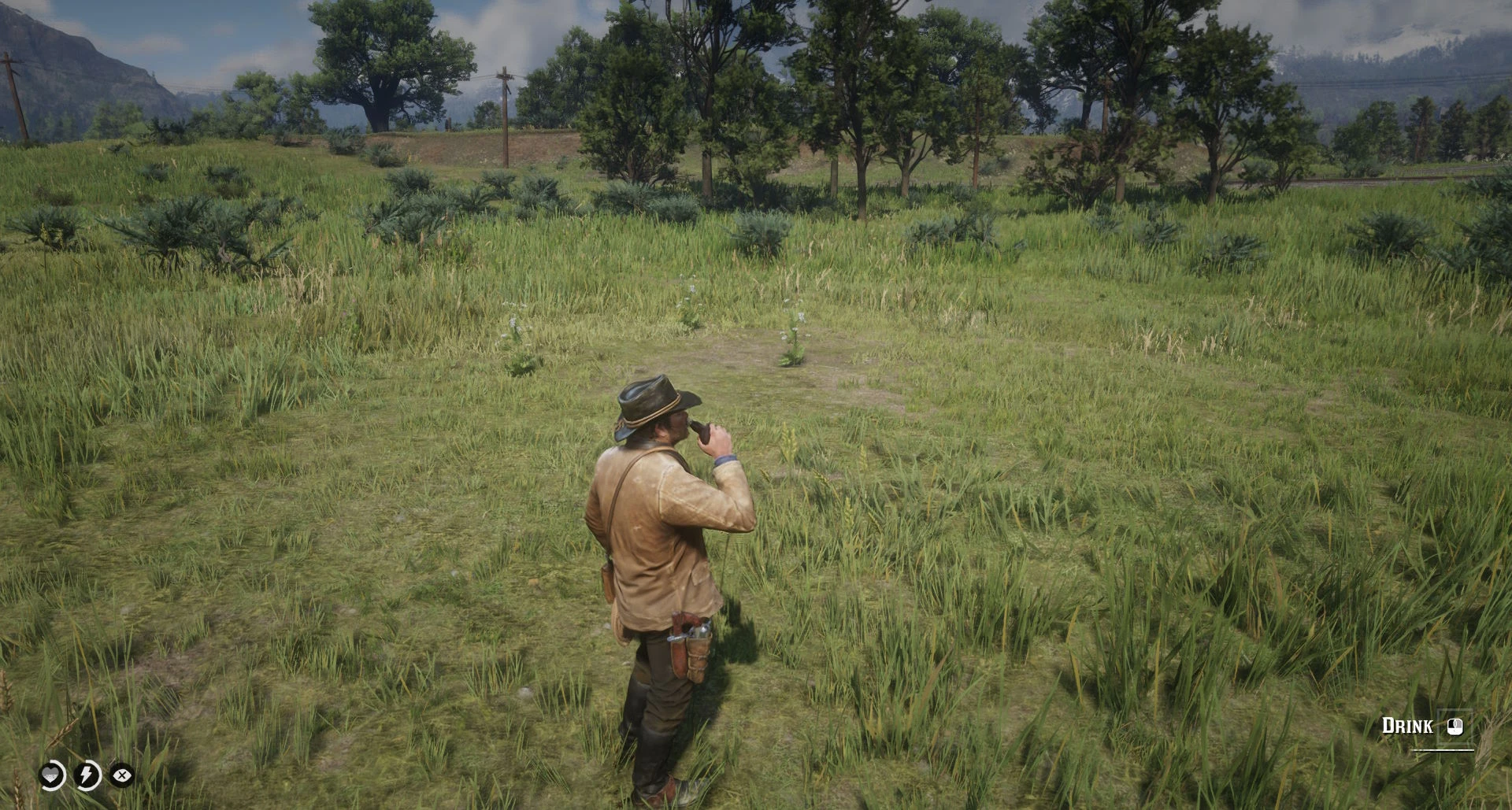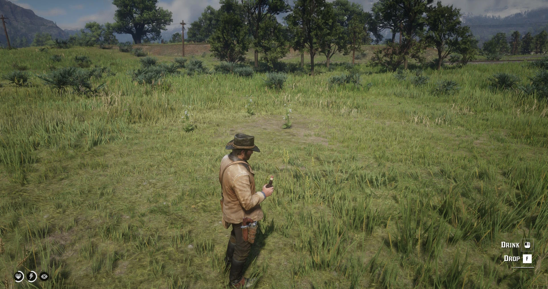 Replaces the item wheel/satchel drinking with the interactive animation found in other drinks like saloon beer and whiskey bottles from camp. Works while on horseback, sprinting and crouching. Core effects and drunkness level remains intact.