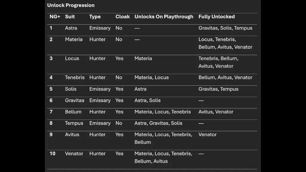 Adds unlockable skins for Starborn spacesuits with each New Game Plus playthrough.
