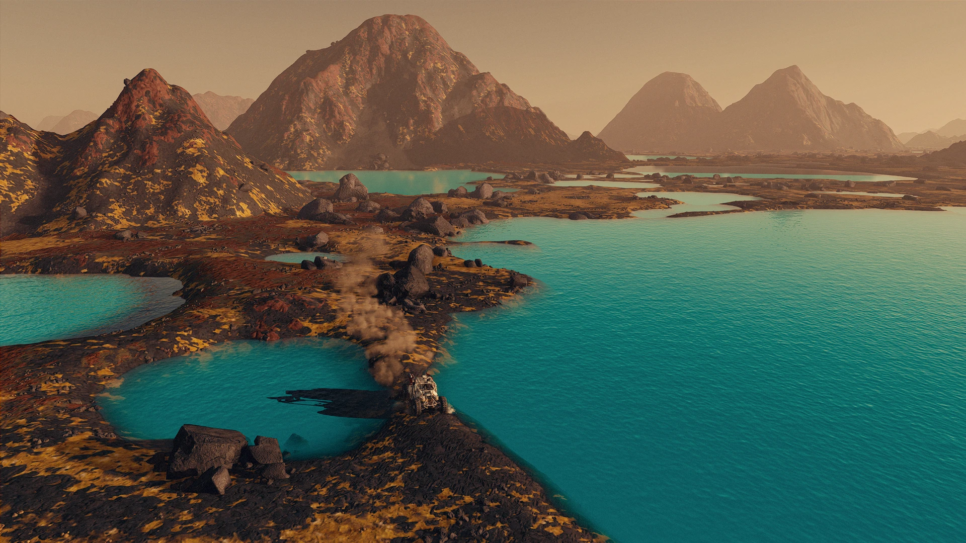 The volcanic biome called “VolcanicRoughNoLife09” is one of the few volcanic biomes that can contain large bodies of water. This mod transforms what would otherwise be a dull biome into a colourful volcanic landscape. Additionally, on moons capable of harbouring water, there are also vibrant turquoise volcanic mineral pools and lakes.