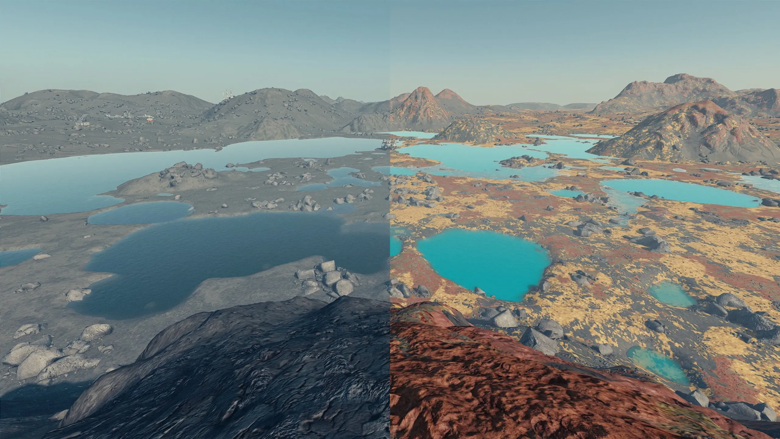 Essentially, the mod is a “skin pack” for the biome. The main file does not modify gameplay mechanics such as flora, fauna, resources, keywords, or quests. To make the two moons with water more appealing as a place to visit and to establish an outpost, an optional file is available to modify the planetary characteristics, so both have an oxygen atmosphere, safe water, and a strong magnetosphere. You can imagine the water being warm and create a hot pool spa retreat at the lakeshore.